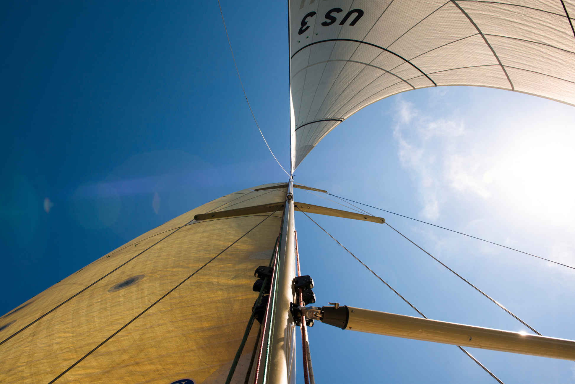 The sails of the classic W-46 "Mustang" stand tall against the sky while sailing off Nnatucket. (Nantucket, MA, August 2016)