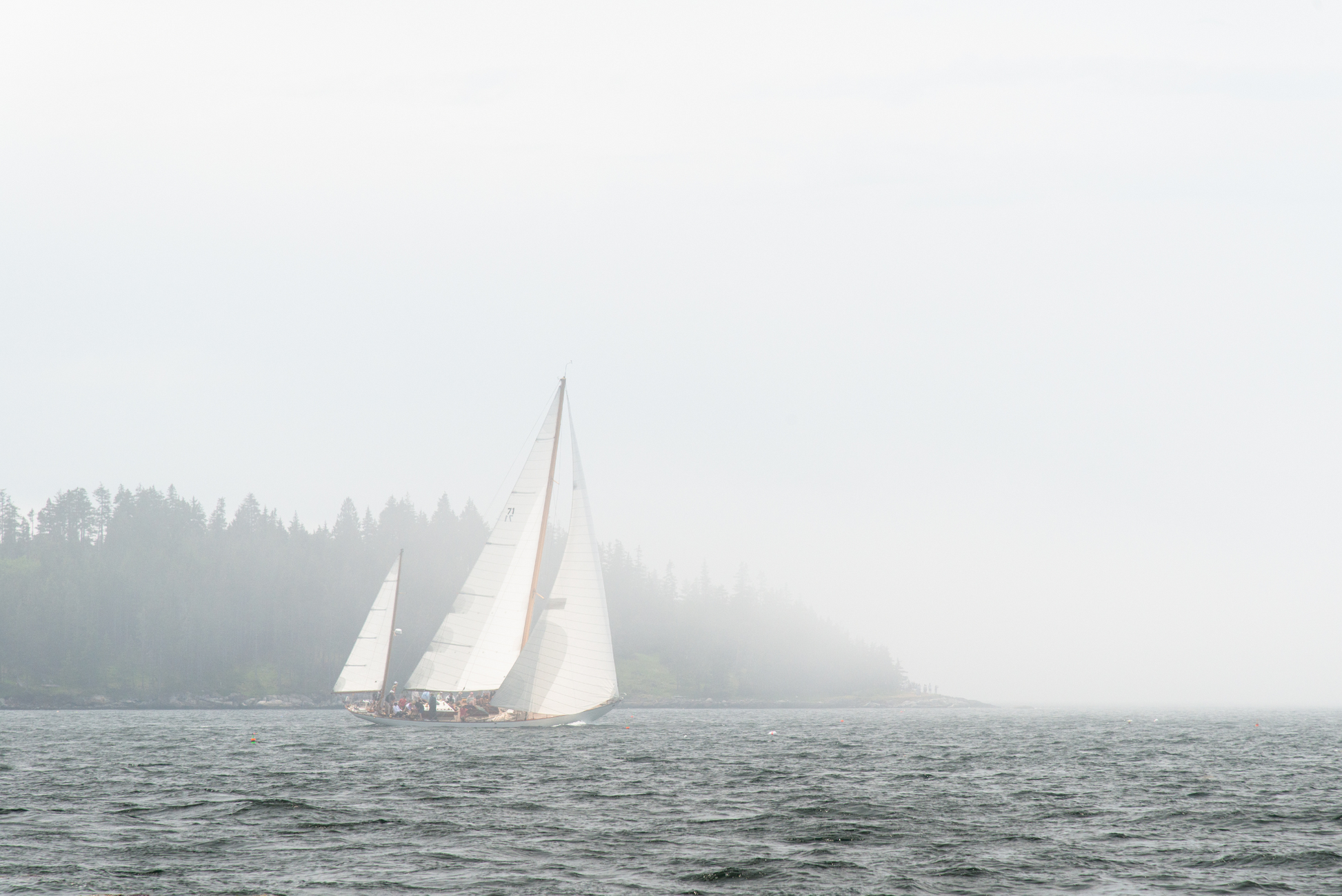 Boats sail into a light fog during the Eggemoggin Reach Regatta in Maine. (Maine, August 2018)