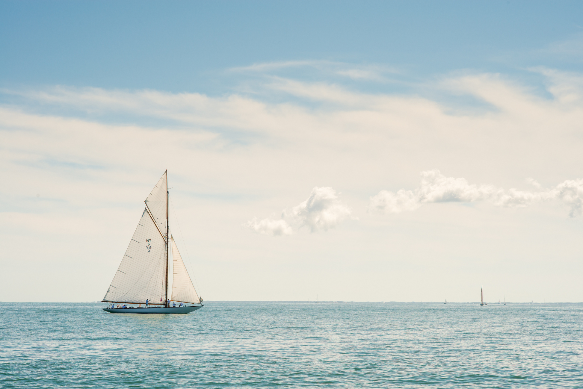 A series of white, puffy clouds seem to lead a restored Herreshoff during the start of the Nantucket Race Week Regatta. (Nantucket, MA, 2015)