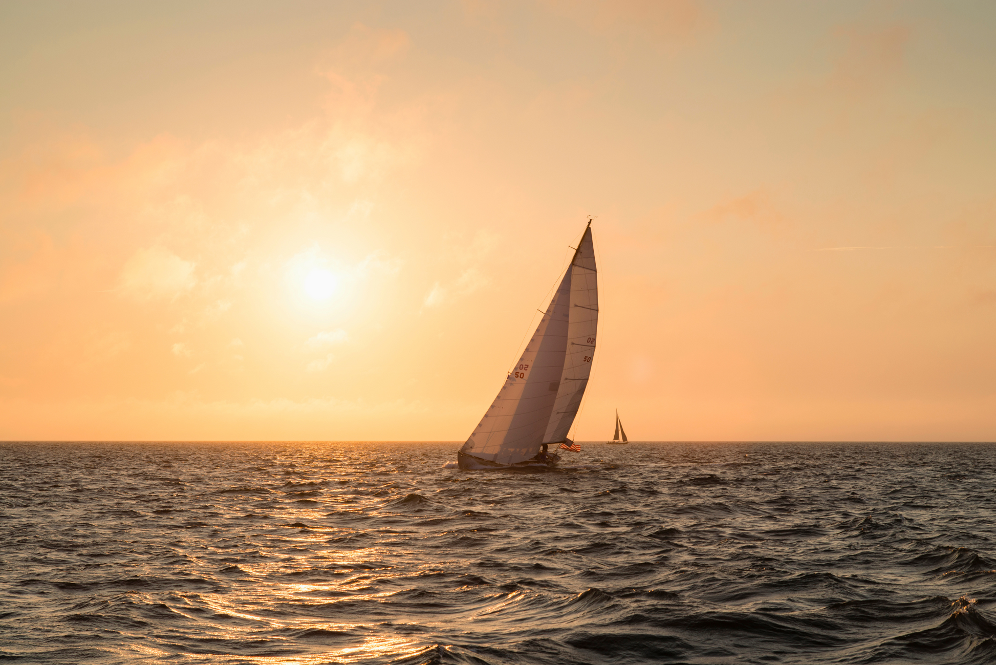 The sun sets on an evening of racing as the classic sailboat "Sonny" returns to Nantucket Harbor. (Nantucket, MA, July 2017)
