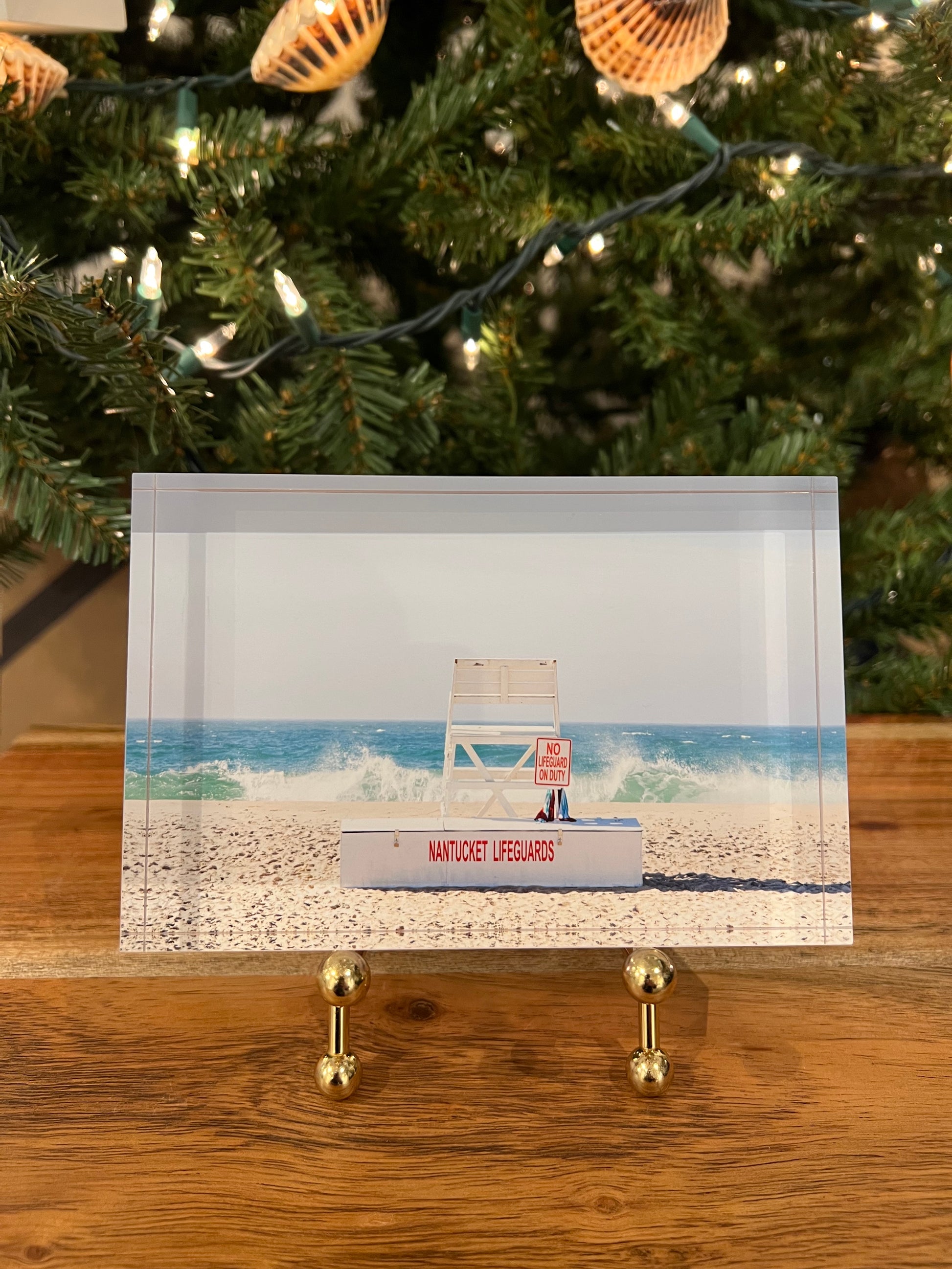 Capture the essence of summer with this vibrant 4x6" acrylic photo block. Featuring a classic Nantucket lifeguard stand against a backdrop of rolling waves and pristine sand, this captivating piece brings the beach vibes straight to your home.