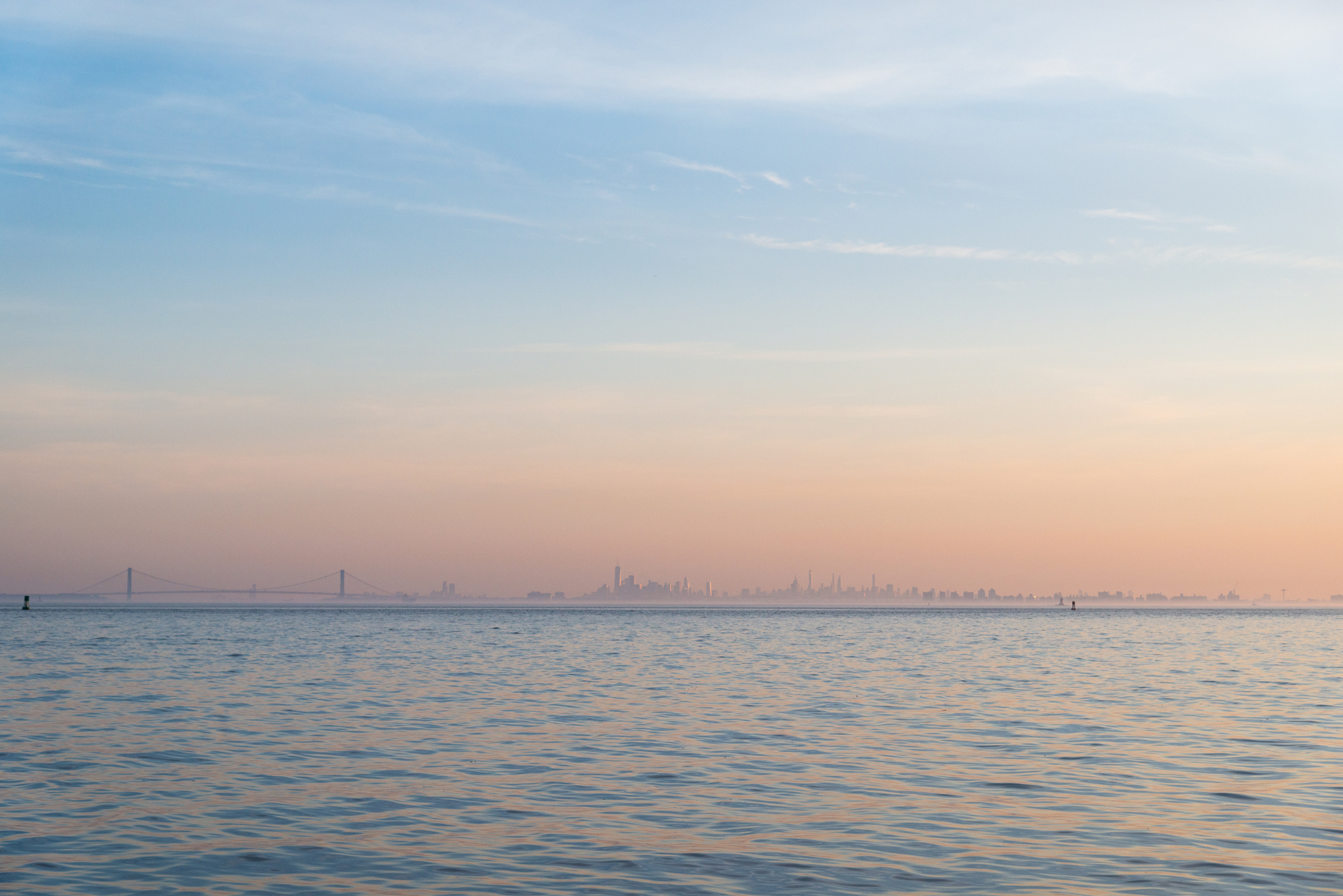 The Mahattan skyline, Brooklyn, and the Verrazzano Bridge cut through an orange haze created by the rising sun from the mouth of the Hudson River. (Hudson River, NY, June 2020)