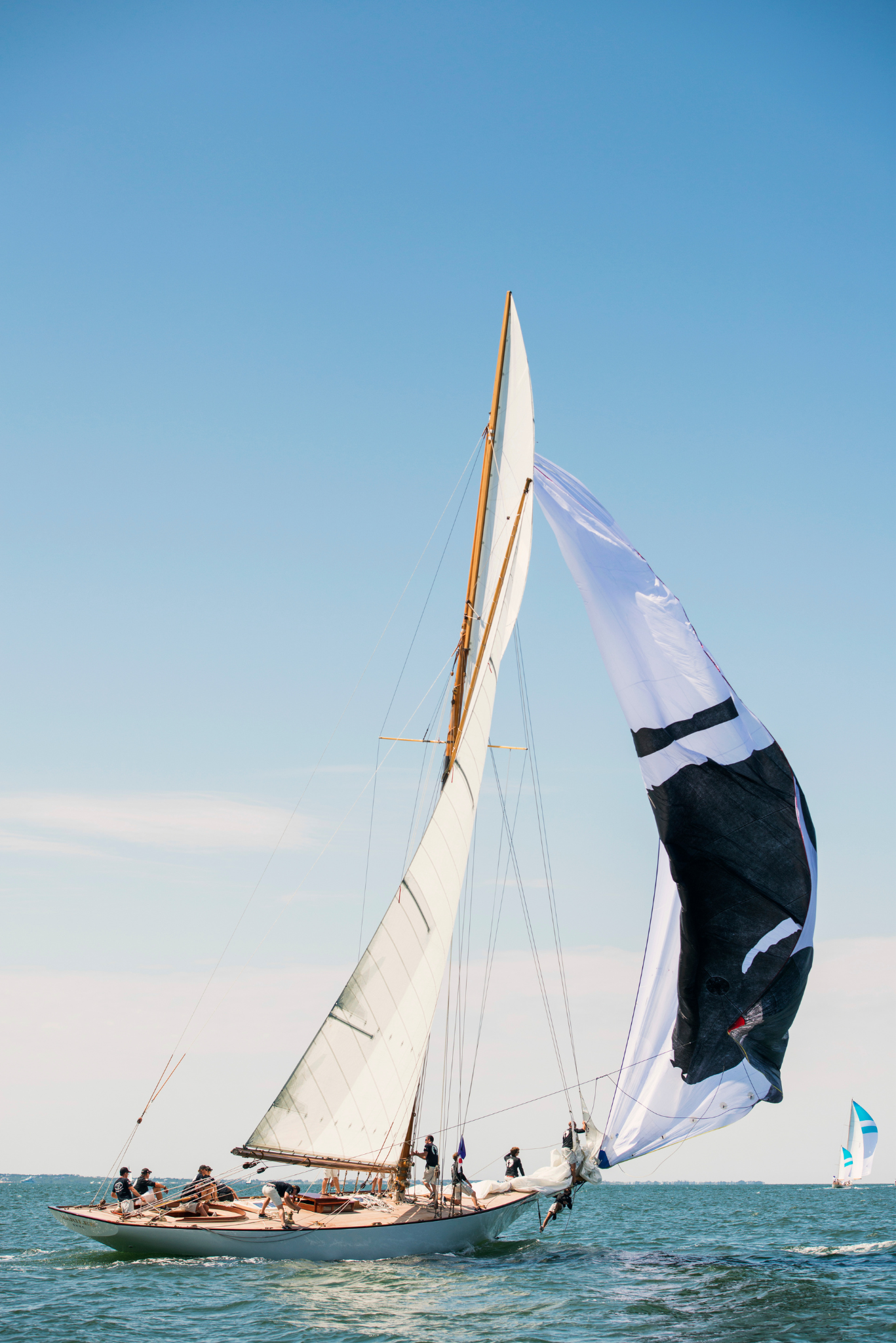 The crew of the restored Herreshoff New York 50 (Fighting 50) "Marilee" race to free a fouled sail while chasing the "Santana" during the Nantucket Race Week. *Nantucket, MA, August 2015)