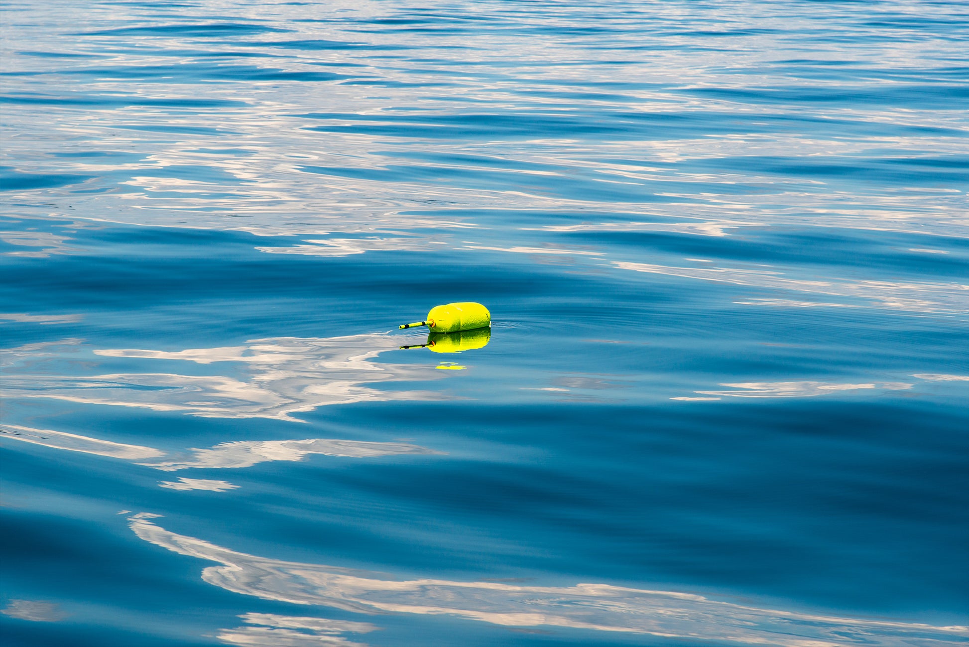 A yellow lobster pot buoy bobs in the glassy waters of Penobscot Bay. (Camden, ME, August 2020)