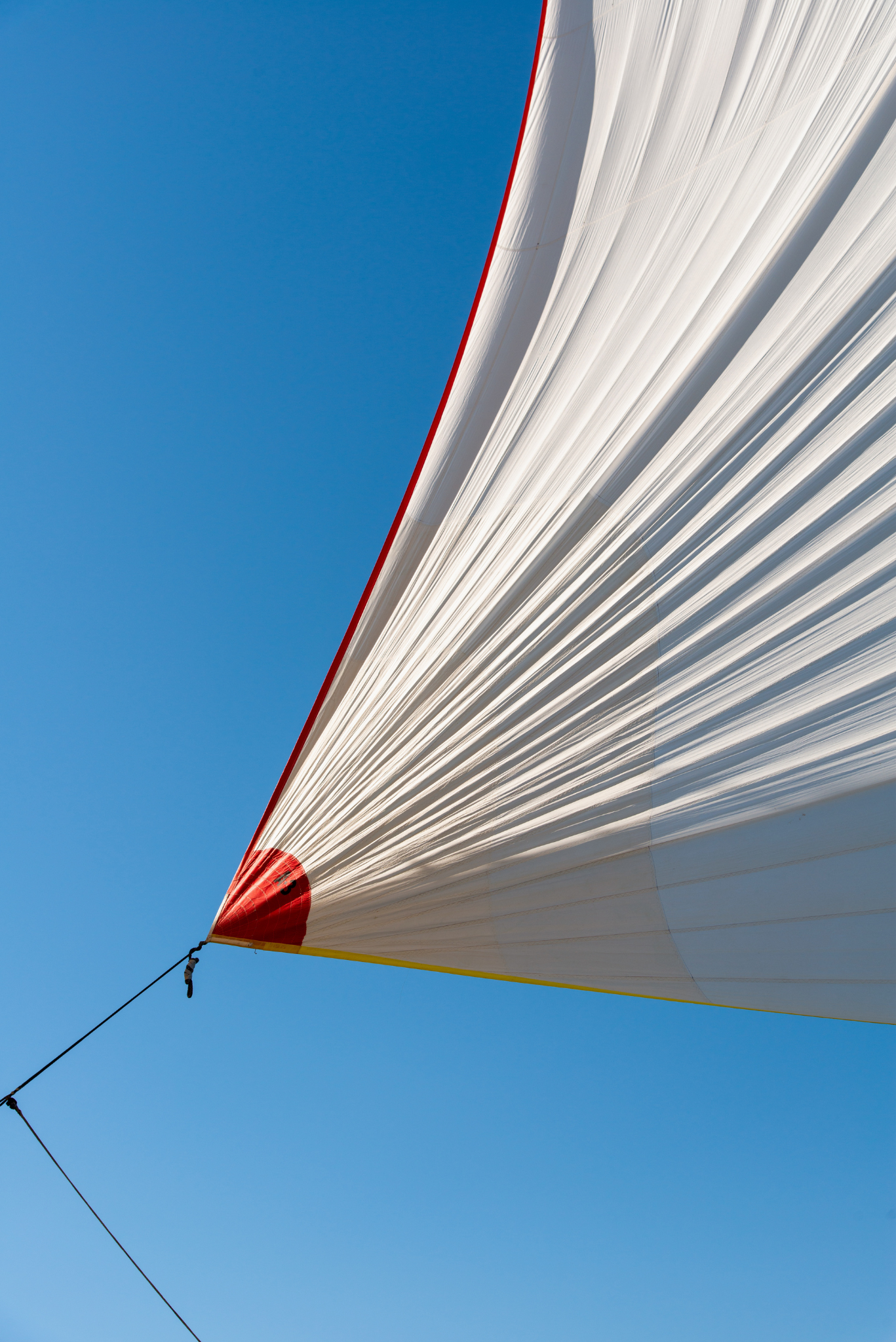 The red clew and white sail of the "Outlier"are a stark contrast against the blue sky during a classic yacht regatta in Camden, Maine. (Camden, ME, July 2020)