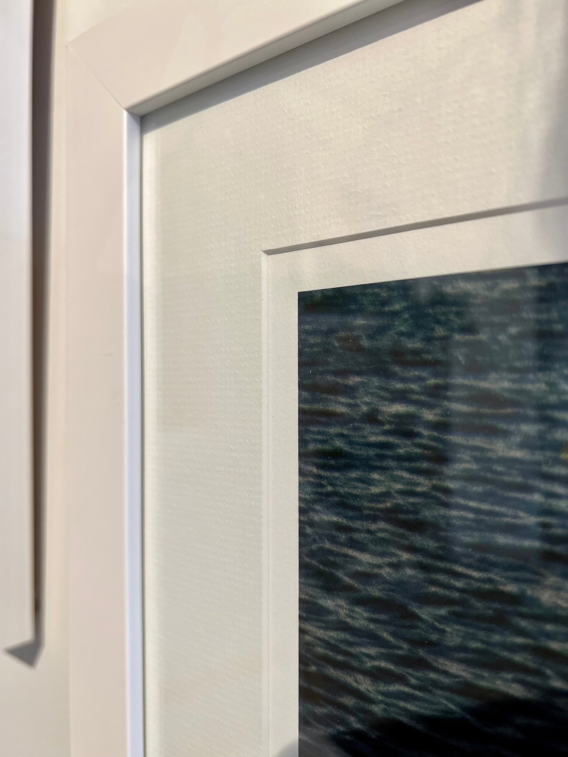 Framed Archival Paper Print, custom white frame with white single mount mat. No discernable imperfections.